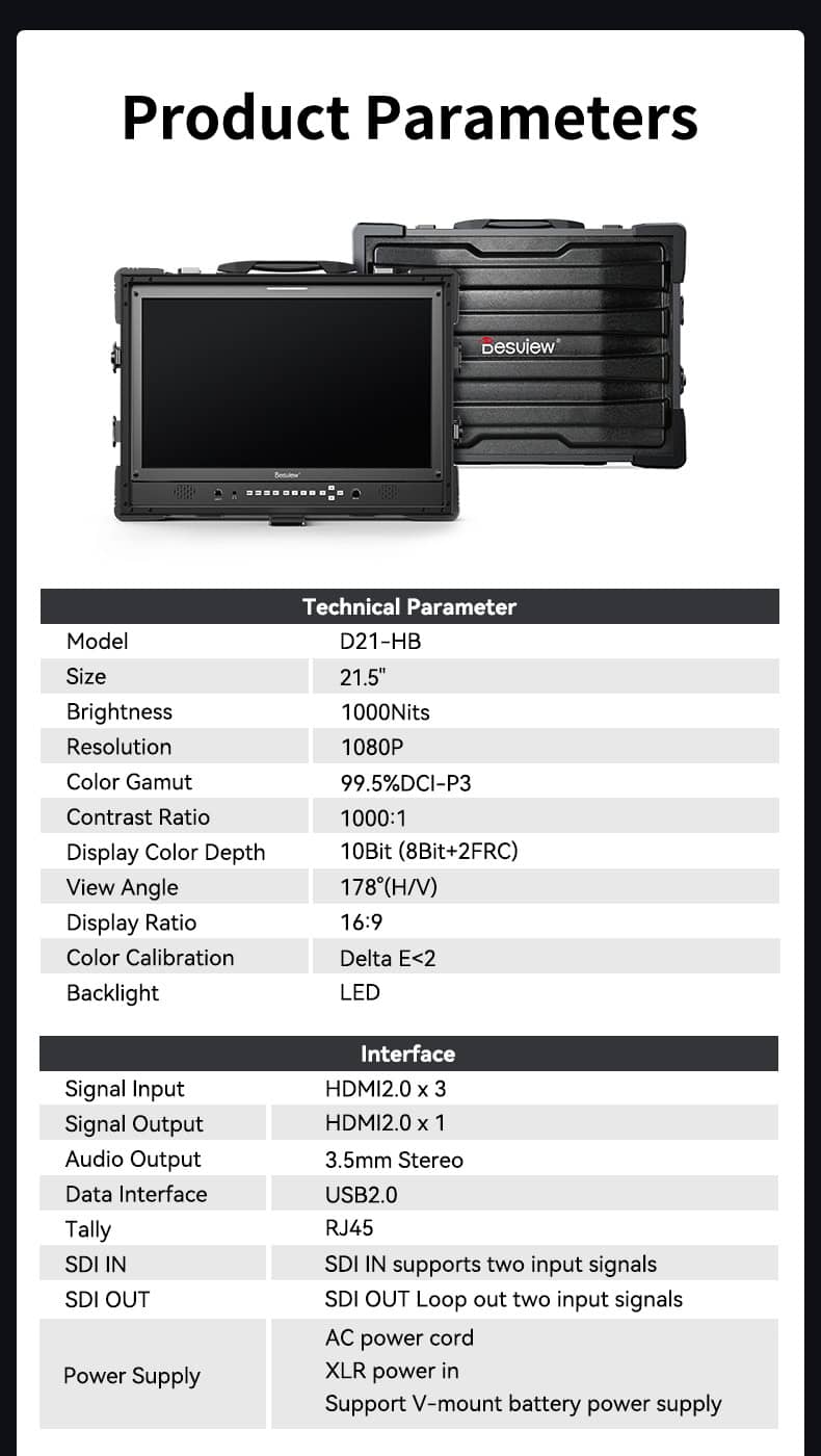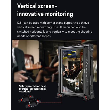 The DESVIEW D21 : 21.5" MULTI-SCREEN BROADCAST MONITOR is a professional broadcast monitor. It features full waveforms and LUTs capability, a safety protection case, and the ability to monitor both horizontally and vertically. It is a versatile tool for various broadcasting needs.