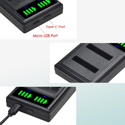 Two-bay charger for NP-50 batteries - Chargable via USB-C or Micro USB