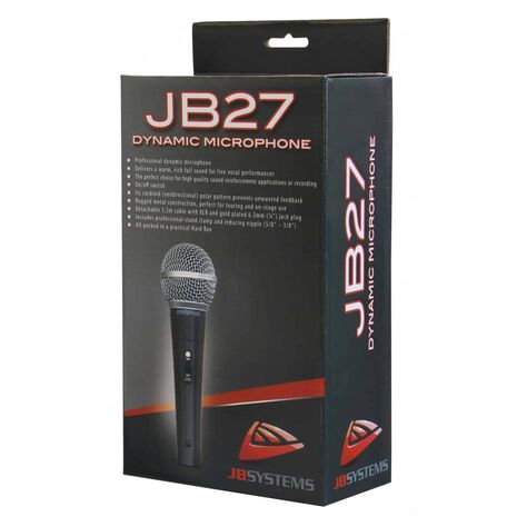 The JB SYSTEMS JB27 : PROFESSIONAL MICROPHONE has a very pure sound quality with good sensitivity. Comes in a kit with an XLR connector, holder, microphone clip and 6m cable with XLR connection to a mono jack plug.