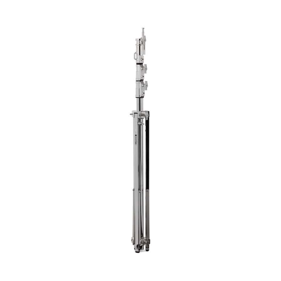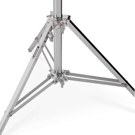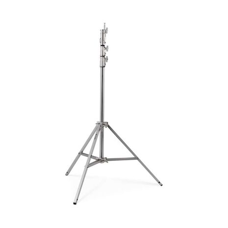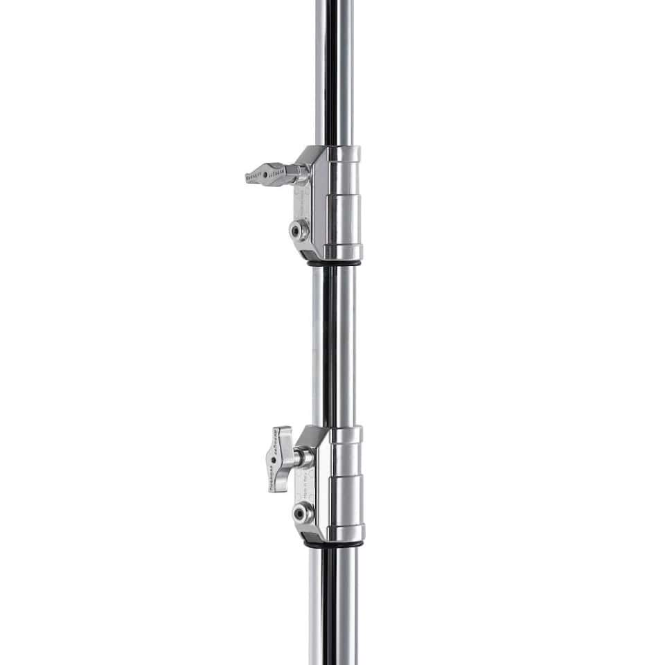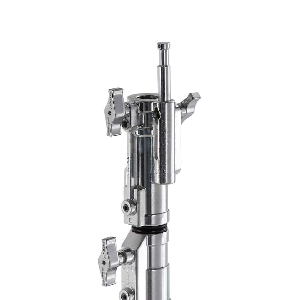 This chrome steel combo light stand has a combo style or universal type top which incorporates a 28 mm/1 1/8 in Junior Receiver and a built-in retractable 16 mm/ 5/8 in non-threaded baby pin.