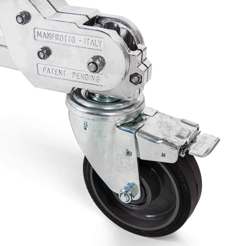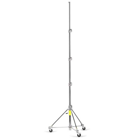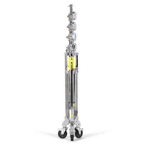 The MANFROTTO AVENGER : STRATO SAFE STAND 4 RISER is a beast of a stand with exceptional performance. This stand has a humorous industry nickname and it is used commonly by grips and gaffers worldwide. It is built in Chrome Steel and Gravity Cast aluminium, comprising of 4 Risers and 5 sections. This stand surpasses industry requirements for safe operation and is part of the Strato Safe family that can lift heavy loads up to 100 kg/220 lbs. Each section uses a uniquely designed gear box that uses a ratchet crank handle to safely raise each riser into place. The ratchet crank handle can conveniently be stored to the top casting of the stand and is always available when needed. Hard Rubber braked wheels are sold with this stand and allow for easy moving in studio and across many smooth to different textured surfaces. This stand comes with a 087WBK wind brace kit for extra securing of the load when required.
