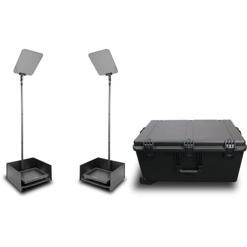 The PROMPTER PEOPLE STAGEPRO TELEPROMPTER : DUAL HIGH BRIGHTNESS KIT is a complete solution including two high-bright monitors, two beamsplitters with stands, a distribution amp, extension cables, and a medium-sized hard travel case. The monitors have a 1000 cd/m² brightness, which would allow for clear visibility even in fairly bright environments. They feature up to 7.5m reading range and offer HDMI, VGA, and composite RCA inputs. The included extension cables are 7.5m long to match the reading range.